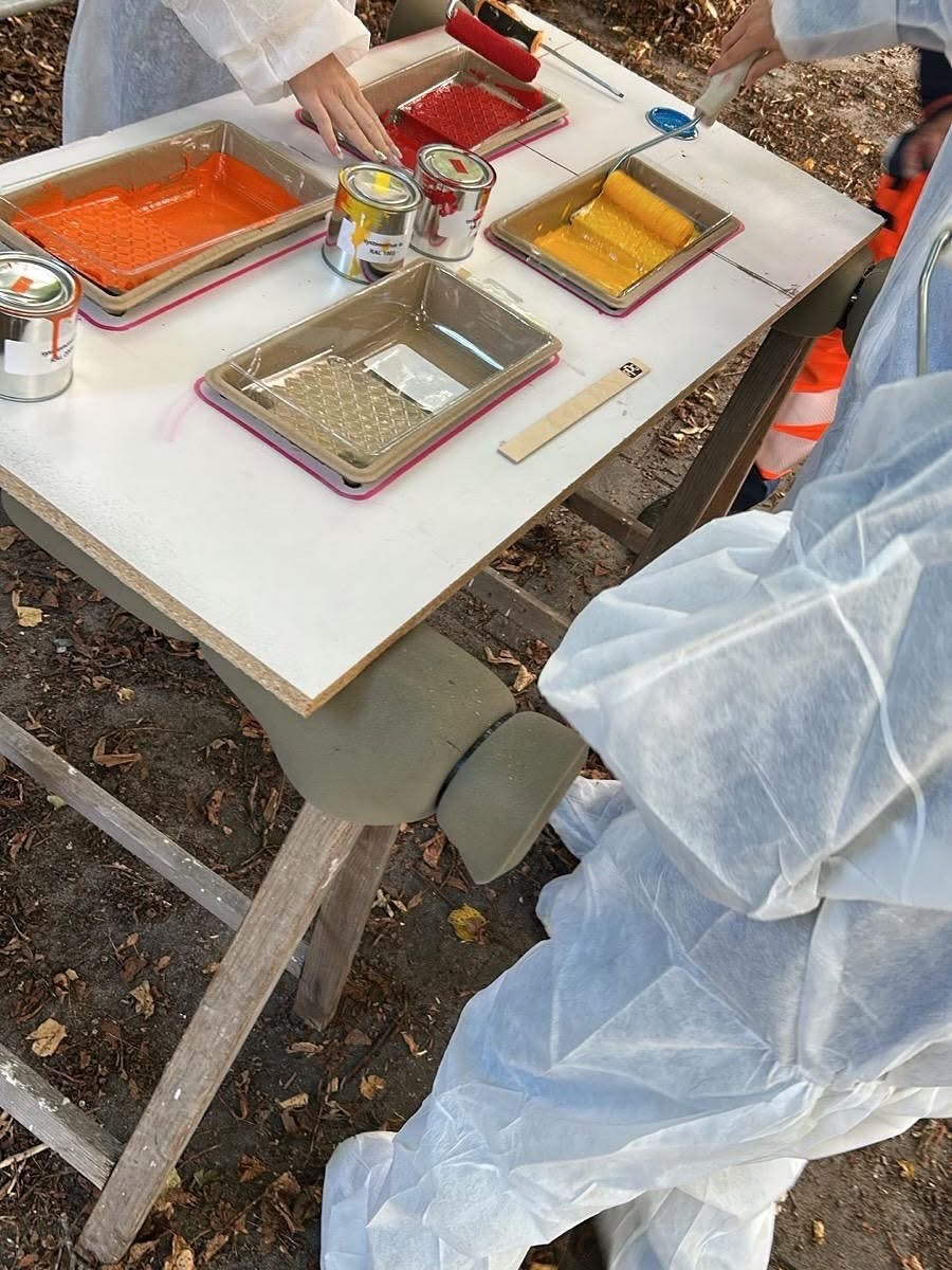 De leerlingenraad is vandaag begonnen met het verven van de bankjes op het schoolplein. Met hulp van en dank aan de gemeente Bloemendaal.